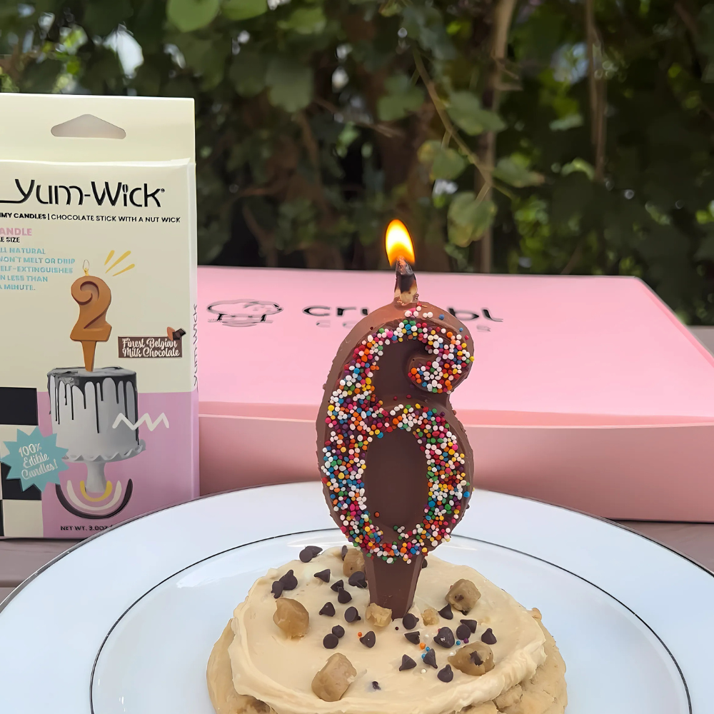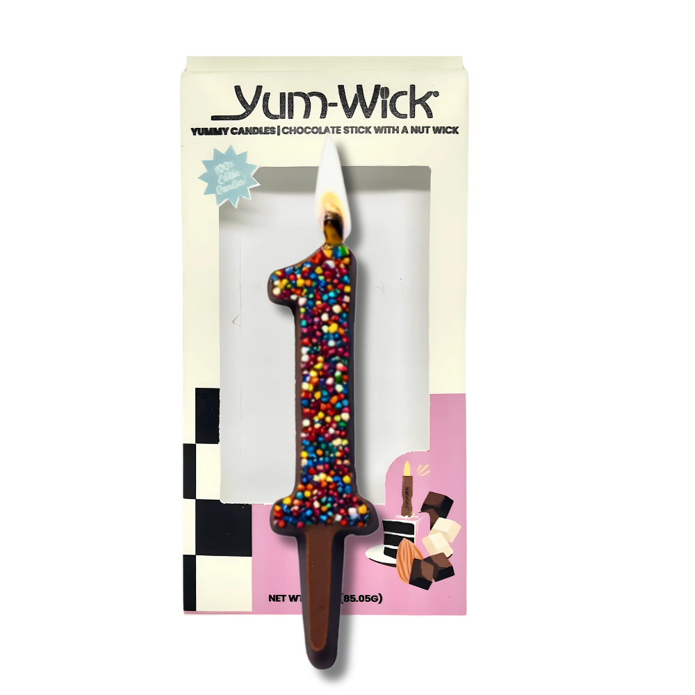 Creamy, classic, and completely edible. Each Yum-Wick® Milk Chocolate Candle is hand-crafted from premium Belgian chocolate with a real roasted almond wick you can light and eat. A kosher, wax-free upgrade to traditional cake candles.